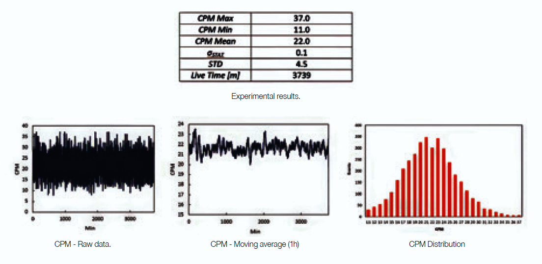 An example of the typical measurement outcome is shown in the table and figures provided below. However, it is important to note that the measured background value strongly depends on the environment in which the detection is carried out.
